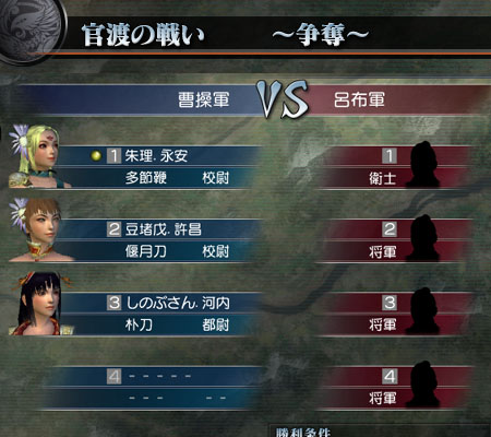なんと、かの有名な官渡の戦いです。我らが曹魏と呂布軍ですけど(* ´▽`)>