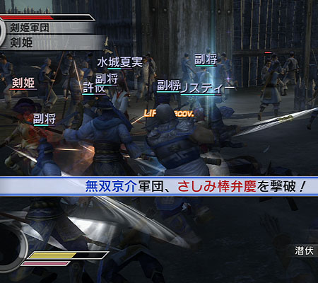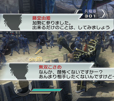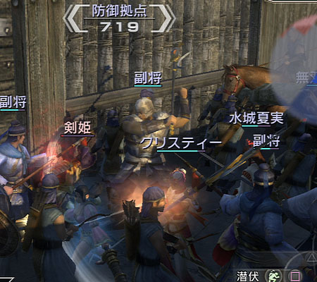 五分の勝負を続ける曹操軍と無双軍でしたが、中央で敵全軍を相手に大暴れしているパパをおとりに、ミカエロ軍が兵糧庫を落とした辺りで、戦況が傾きます。