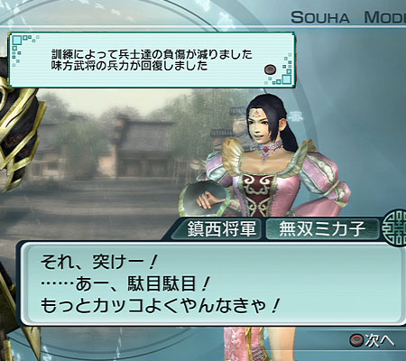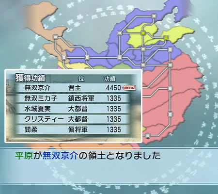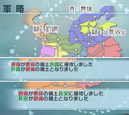 戦闘は見ての通り、通常通りの"無双"だし、内政は無いような(シャレ)もん。次に攻める場所(ステージ)選択するとか、自兵力を回復させるために、何もしないで終了とかその程度です。