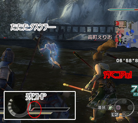 敵先陣の剣姫さんとの決戦中、なぜか体勢を崩されたり、細かいダメージを受けると思ったら、人垣の向こうからふぁーさんのウィップの牽制を浴びていました。