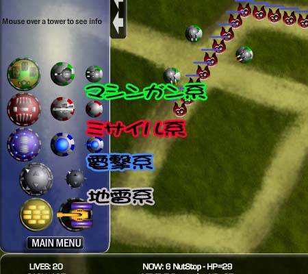 それを、道中各所に設置した砲台で迎撃する、っていうのがタワーディフェンス系ゲームのゲーム要素なのです。