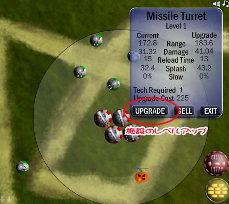 ミサイル強化施設建造後の、ミサイル砲台(画面のやつね)で、イカす誘導ミサイルが敵を撃破しまくるのが超快感です(* ´▽`)