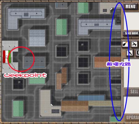 こんな具合に、敵の侵攻ルートが街路を縫うように進んで来るので、