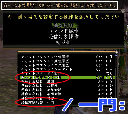 とりあえず、TAB等で会話の種別を切り替える以外の発言コマンドは、『/一門:』です。