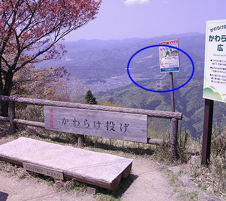 三枚100円だったかな。"かわらけ"っていう素焼きの小さなお皿を買って、この踏み台からフリスビーのように投げるのです。