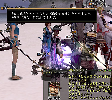 信玄公から、海女さん変身薬を受け取り、変身時間の三分間の間に