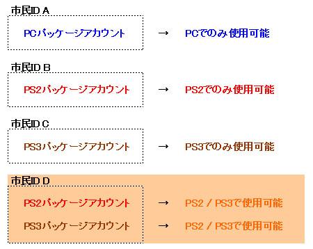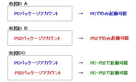 こちらにある通り、アカウントをPC・PS2 両方で起動するためには、一つの市民ID内に