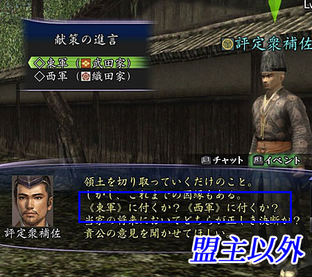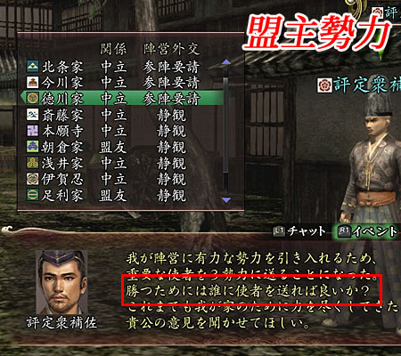盟主以外の12勢力は、それぞれ東軍と西軍のどちらに味方するか、献策を行います。