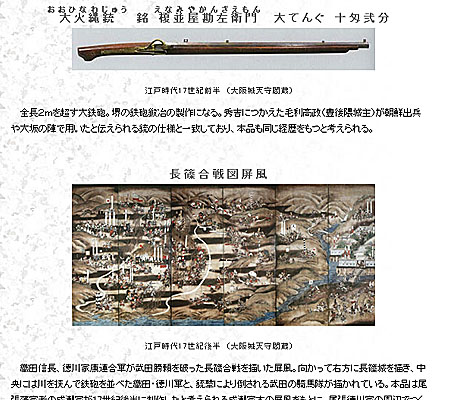 長篠・小牧長久手・関ヶ原・大坂の陣と各種合戦図屏風の複製が飾られており、展示品も