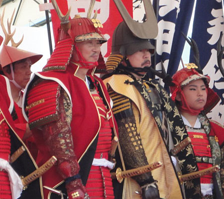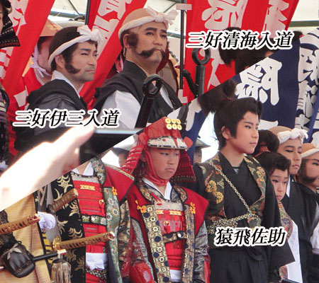 真田親子、真田十勇士に扮した甲冑武者が壇上に上がります。