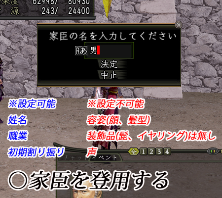 家臣のキャラクターメイキング要素としては、見た目関係の容姿が全くランダムであるという
