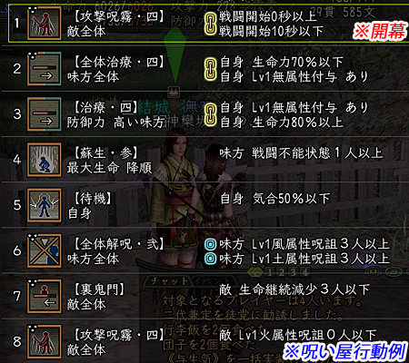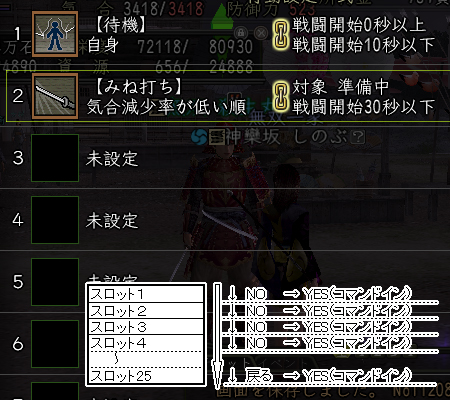 家臣は、コマンド投入タイミングごとに、スロット1から順に行動判断を行い、行動条件が