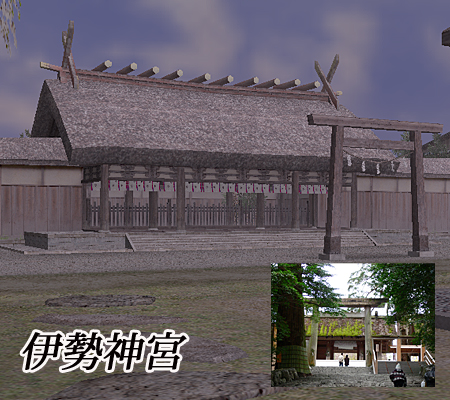 こちら、鳥居とわらぶき屋根がインパクト大の伊勢神宮。