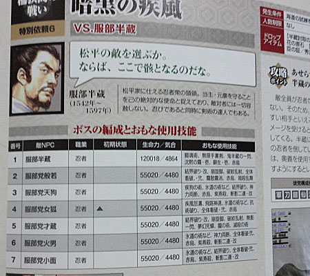 生命・気合・使用技能や簡単な戦闘のギミックと対抗方法が紹介されてます。