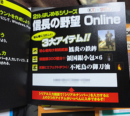 ゲーム情報に終始していました。真ん中に特典のシリアルが見えますね。